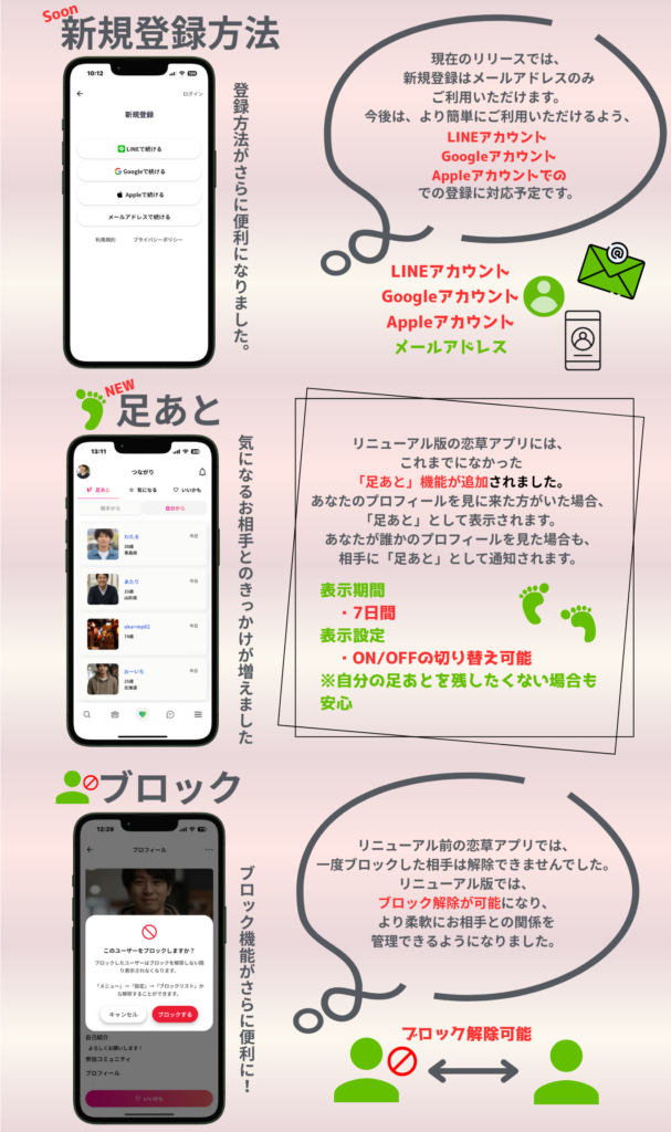 恋草アプリが生まれ変わります! お知らせ リニューアル延期のお知らせ 2026年4月8日(水)に予定しておりましたリニューアルにつきまして 品質向上のため、リリース日を延期させていただくこととなりました。 新たなリリース日につきましては、決まり次第ご案内いたします。 \ \ 2026年4月17日(金)リニューアルいたしました! // 主なリニューアル内容! もっと便利に。出会いやすく。恋草アプリが新しくなります。新しいデザインと機能で、これまで以上に快適にご利用いただけます。ぜひリニューアル後の恋草アプリもお試しください。 銀行振込決済停止のお知らせ2026年4月15日(水) 00:00 〜アプリリニューアル完了まで、銀行振込による決済はご利用いただけません。 障がいをもつ方が主役の 恋草 「かんたん」「親せつ」 恋活・婚活 マッチングアプリ かんたん無料登録 ※ 20歳未満のご利用は出来ません。 今すぐ始める
