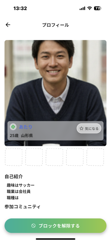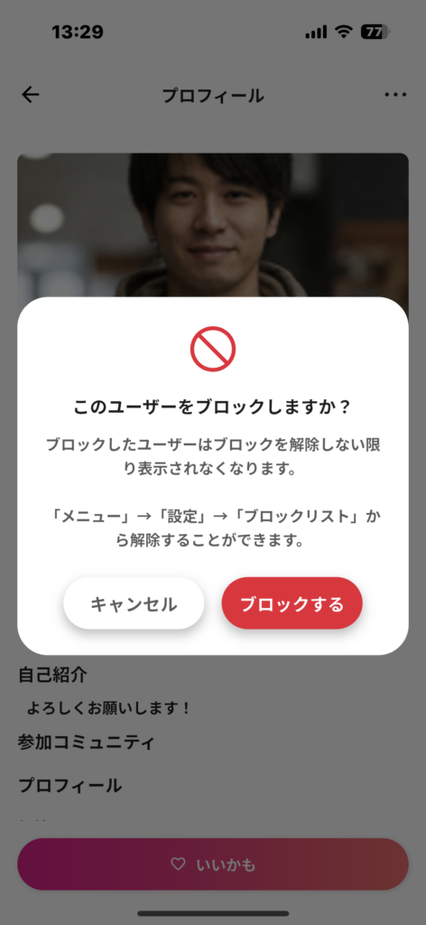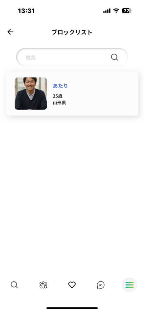 ブロック トークNEW ブロック ブロックとは? 設定するとお相手は非表示となりお互いにコンタクトをとることが出来なくなります。※いつでもブロック解除が可能です。 ブロックの設定 ① ブロックしたいお相手のプロフィールを表示します。右上の「・・・」から『ブロックする』を押してください。 ② 選択するとお相手は非表示となりお互いにコンタクトをとることが出来なくなります。※いつでもブロック解除が可能です。 ブロックリスト ① 右下三本線を押してメニューを表示し『設定』を押してください。 ② 『ブロックリスト』を押してください。 ③ ブロックしたお相手の一覧が表示されます。 ブロック解除 ① ブロックリストから解除したいお相手のお写真をタップしてください。 ② 『ブロックを解除する』を押してください。