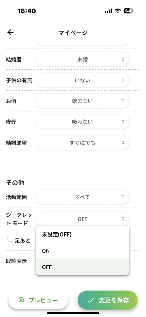 ※シークレットモードを「ON」に設定した場合は、足あとの設定はできません。その場合、足あとは「OFF」の設定となります。