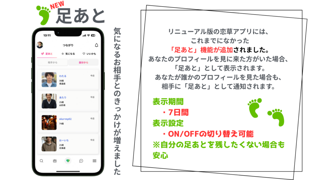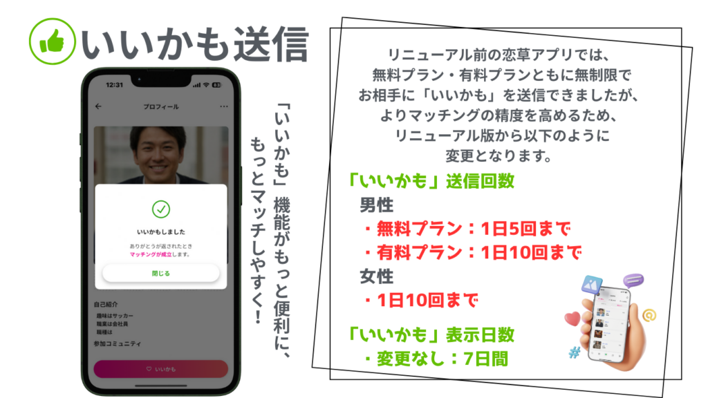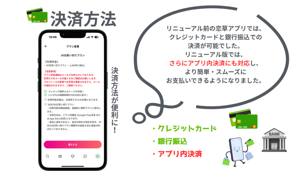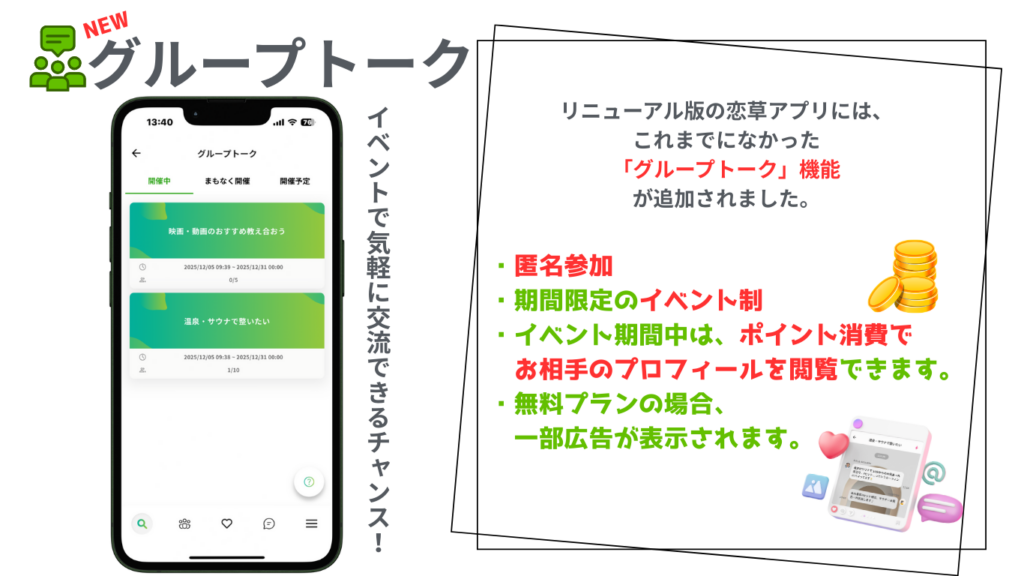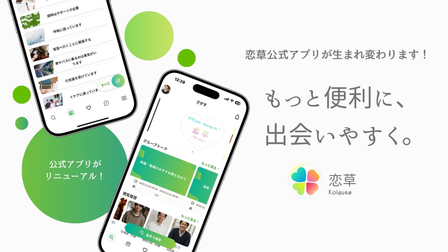 恋草アプリが生まれ変わります! お知らせ 「\恋草アプリは、2026年初旬にリニューアルを予定しています。/」 主なリニューアル内容! もっと便利に。出会いやすく。恋草アプリが新しくなります。新しいデザインと機能で、これまで以上に快適にご利用いただけます。ぜひリニューアル後の恋草アプリもお試しください。 銀行振込決済停止のお知らせ2026年1月5日〜アプリリニューアル完了まで、銀行振込による決済はご利用いただけません。