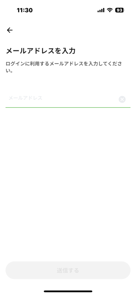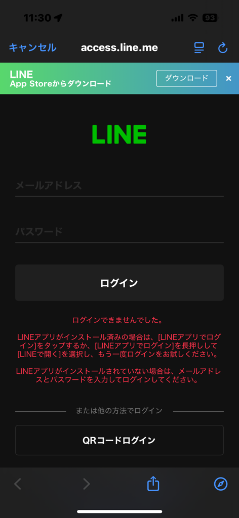 LINEアプリがインストールされていない場合は、LINEアカウントのメールアドレスとパスワードを入力し「ログイン」してください。