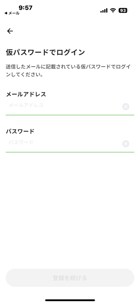 認証メール(仮登録のお知らせ)に記載のURLにアクセスし、メールアドレスと「仮パスワード」を入力し「登録を続ける」を押してください。※仮パスワードは、認証メール(仮登録のお知らせ)に記載してあります。