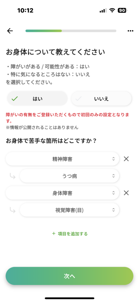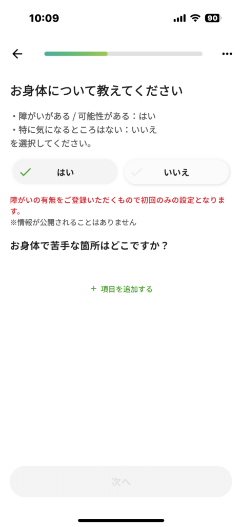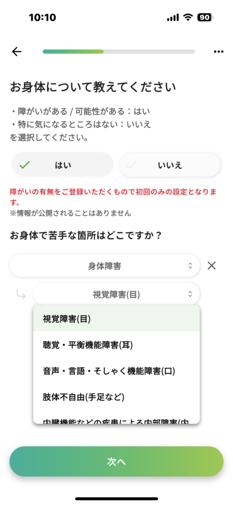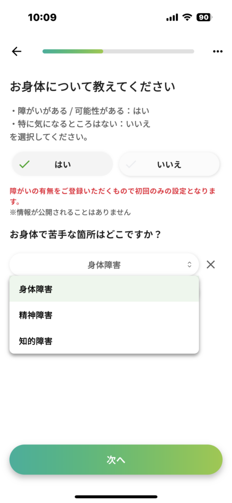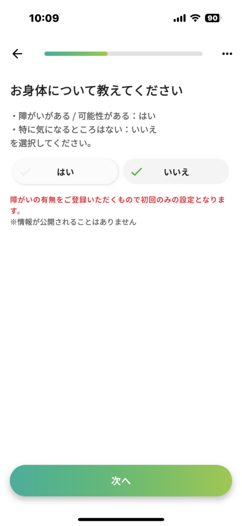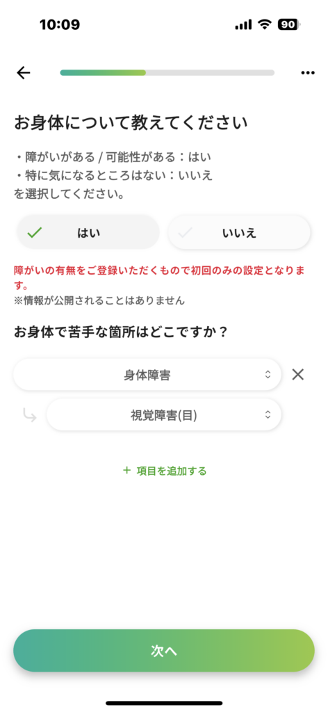 ・「障がいがある」若しくは「可能性がある」場合は、「はい」を選択してください。
