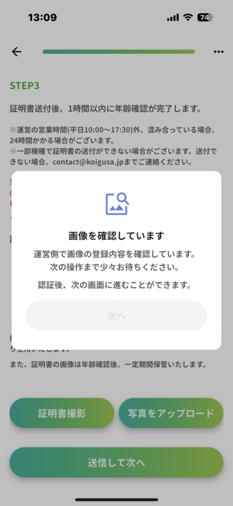 認証後、次の画面に進むことができます。それまでしばらくお待ちください。